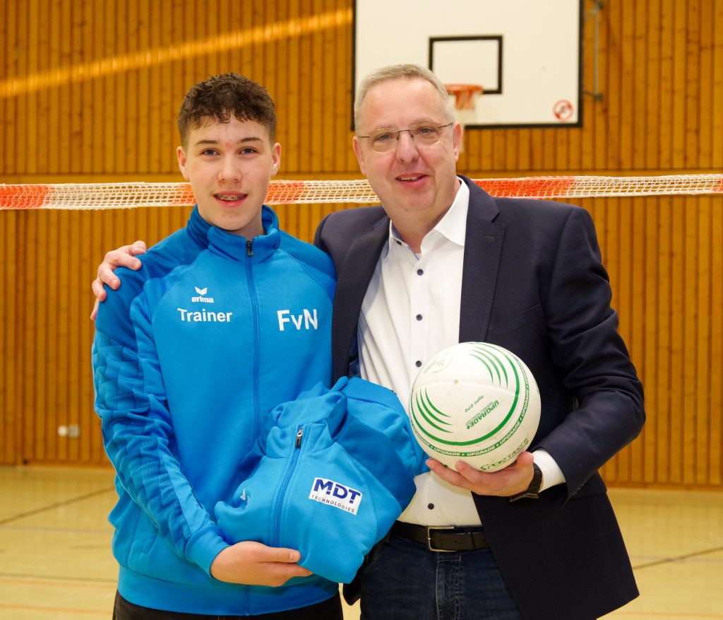 In Vertretung der Firma MDT technologies GmbH überreichte Herr Manfred Schulz die gesponserten Trainingsanzügen an den Trainer des Faustballnachwuchses, Felix von Naguschewski.